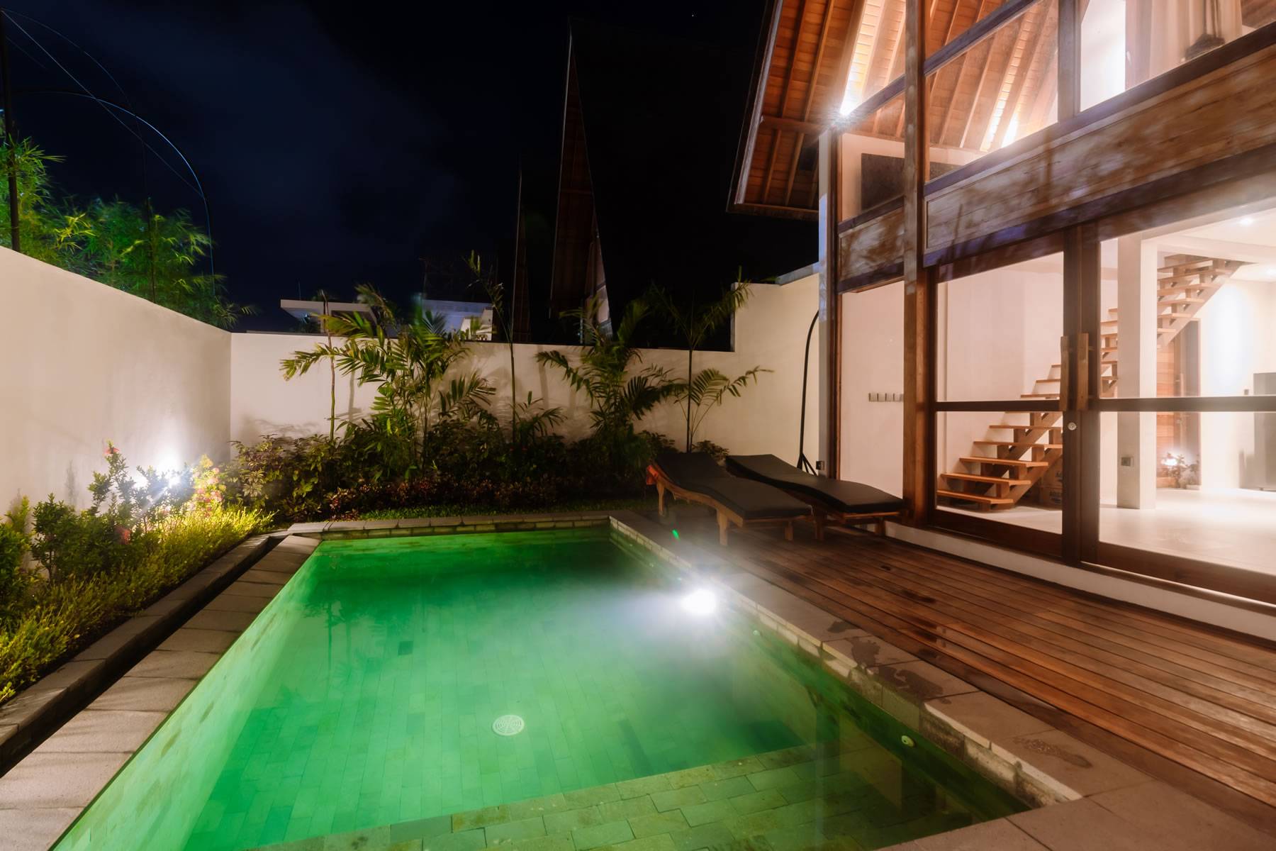 Outside, a private pool surrounded by wooden decking and lush landscaping creates an intimate, relaxing oasis perfect for unwinding in nature’s embrace.